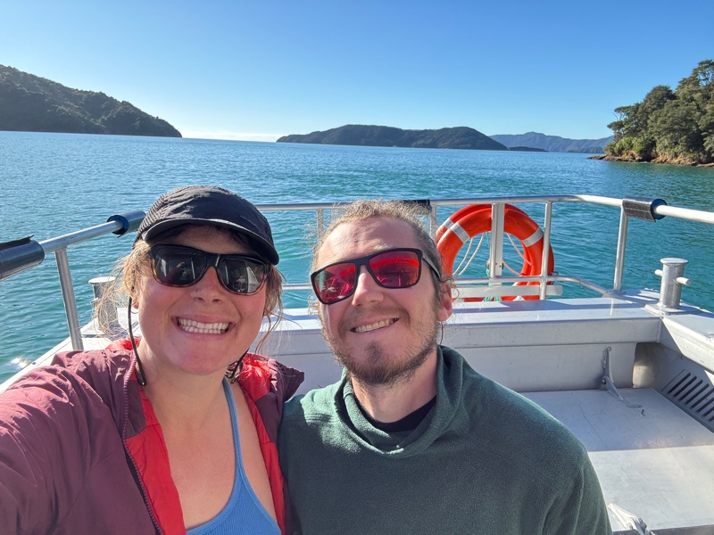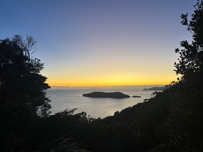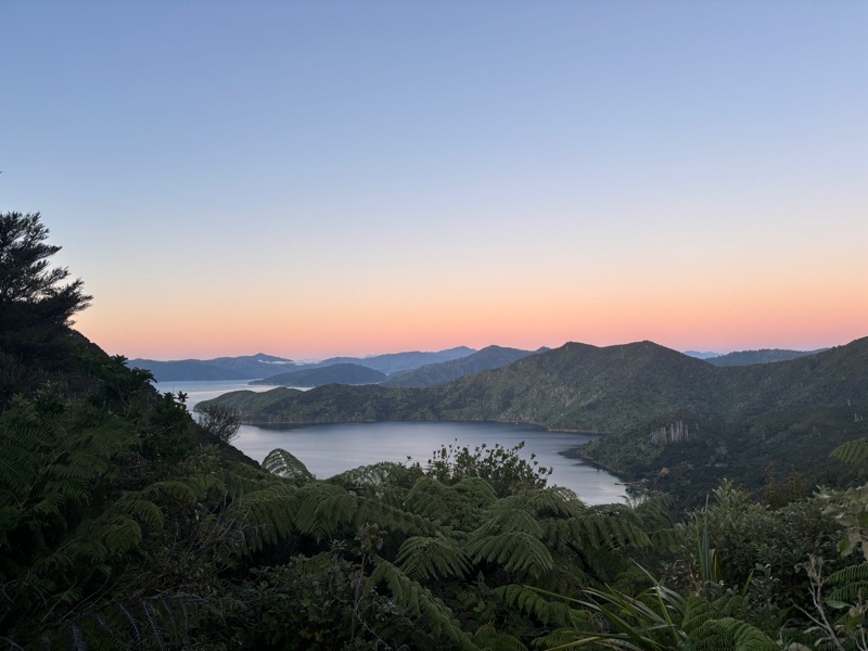 My alarm set for 6:45 went off just as we reached the saddle and there was just enough light to turn off my headlamp. A view of Schoolhouse Bay, where we spent the night, was yet to emerge in the dark. To our east, there was a stunning view of Motuara island and what we guessed was the north island obscured by clouds. We celebrated our accomplishment with two rounds of french-pressed coffee while we watched the sun come up. I cried, and smiled with my eyes closed as I felt the warmth on my face. Slowly the birds woke up around us; a symphony of tomtit, pīwakawaka and korimaku singing. A rustle in the bushes, and a weka came out to join the party. Once we finished our coffee, a short 2 km walk led us to the ocean where we stripped off to swim before the water taxi arrived. On our boat ride to Picton, we watched the pakaha birds soar over the water and even saw a kekeno seal. We each ate half-baked chocolate chip cookies as we speculated where the trail crossed over the ridge to our west and where the trail had been washed out by the 11cm of rain we received a few days ago. I could not imagine a better way to end our journey.